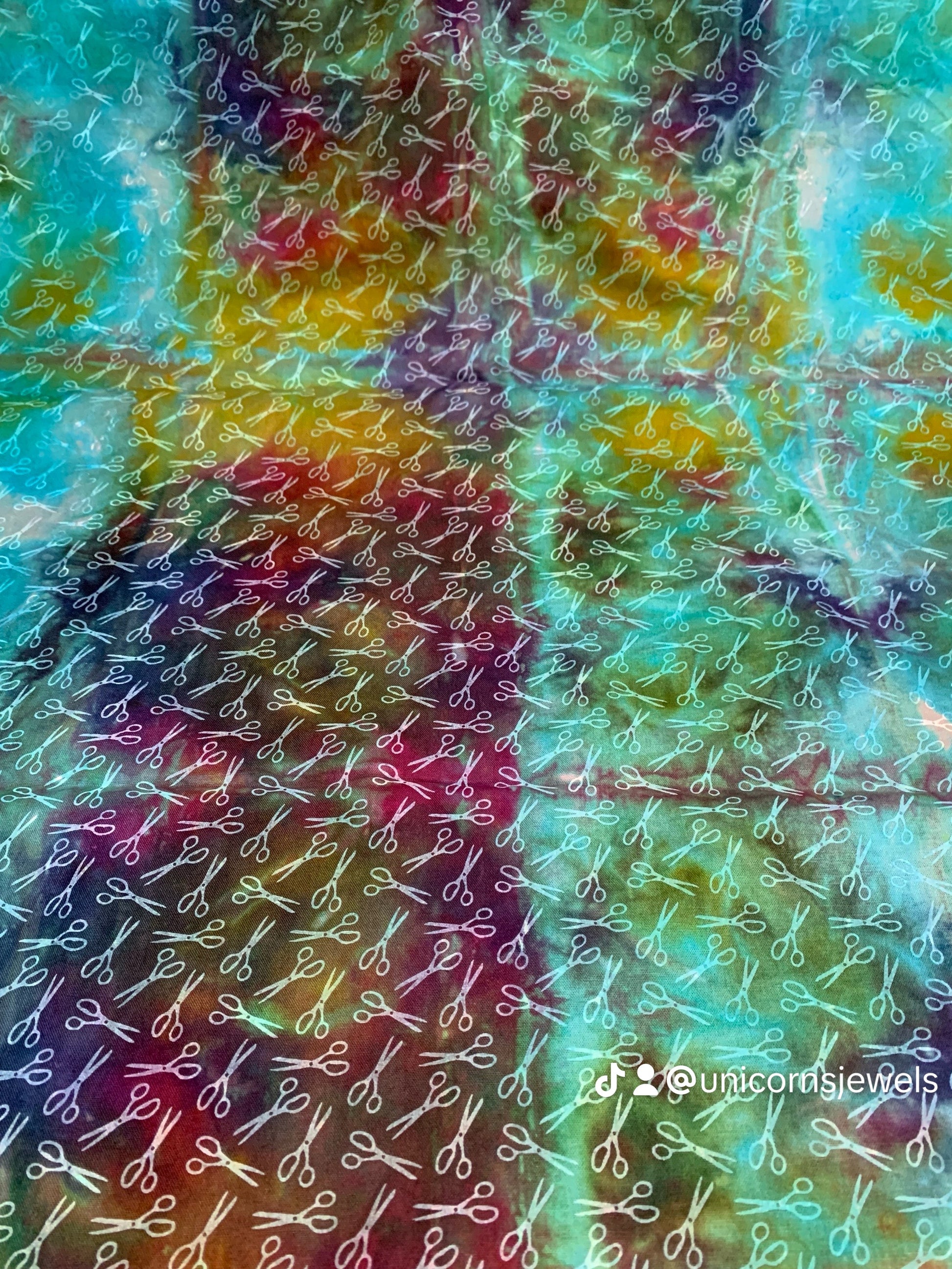 This is a one of a kind icy dyed (1 yard of Fabric.) Larger scissors are about 3/4". This is a one of a kind piece of fabric. There will be no other like it.